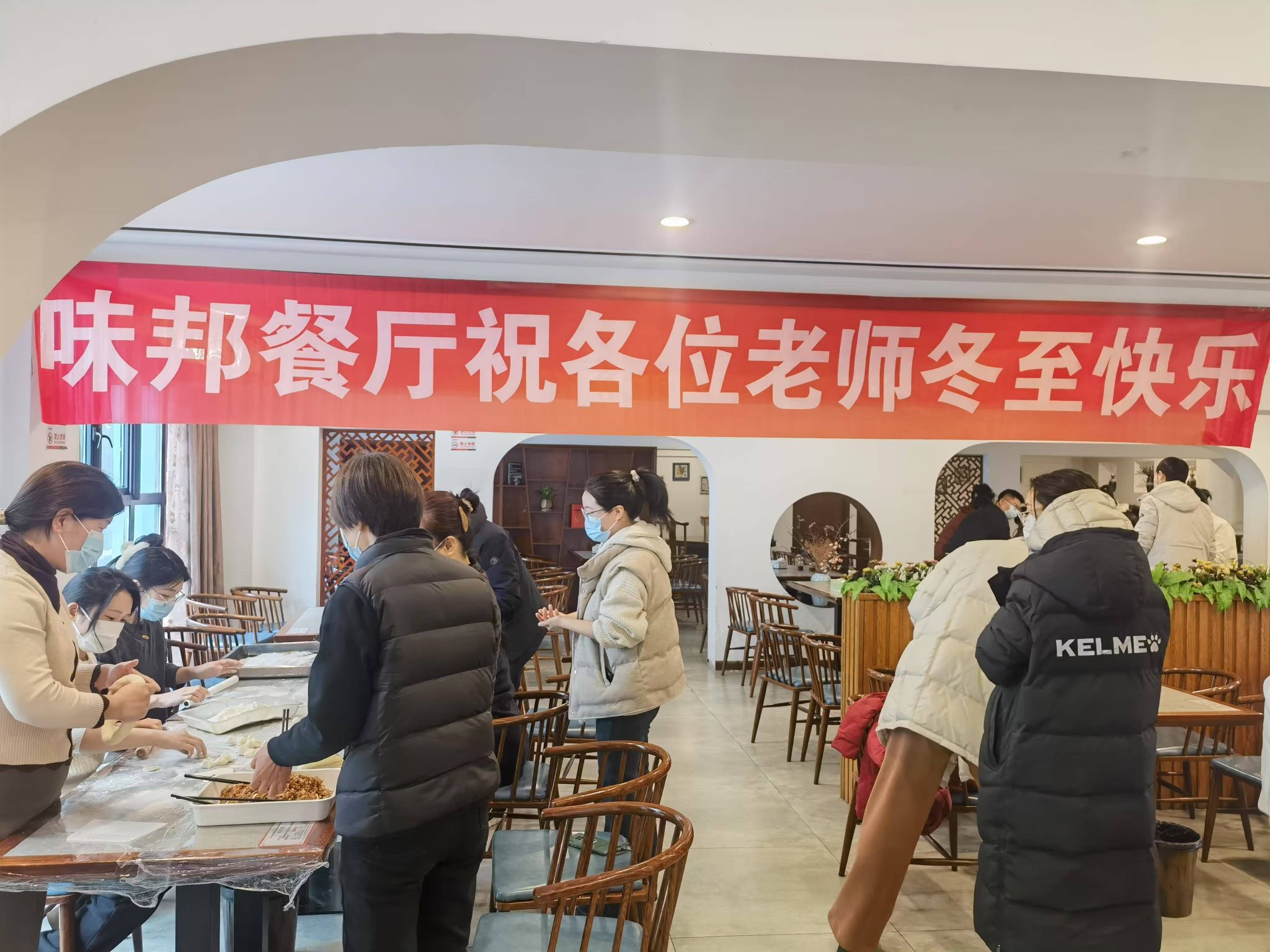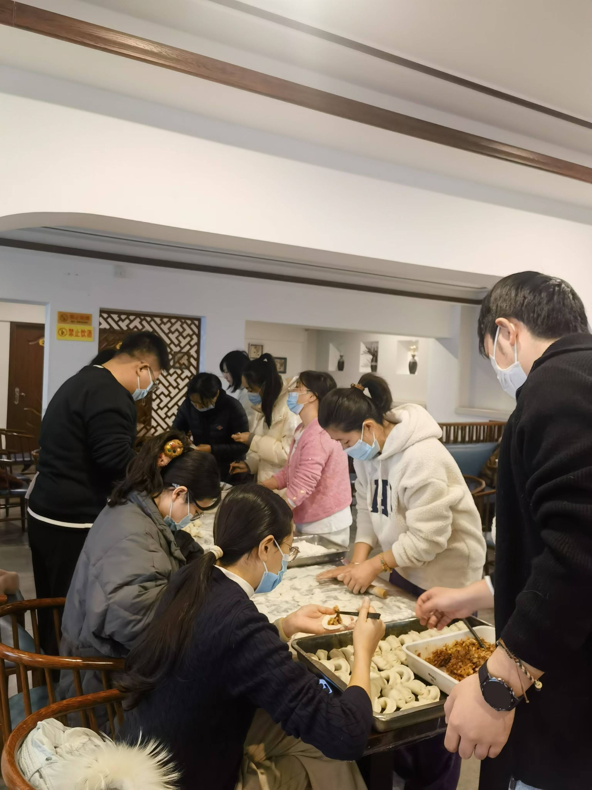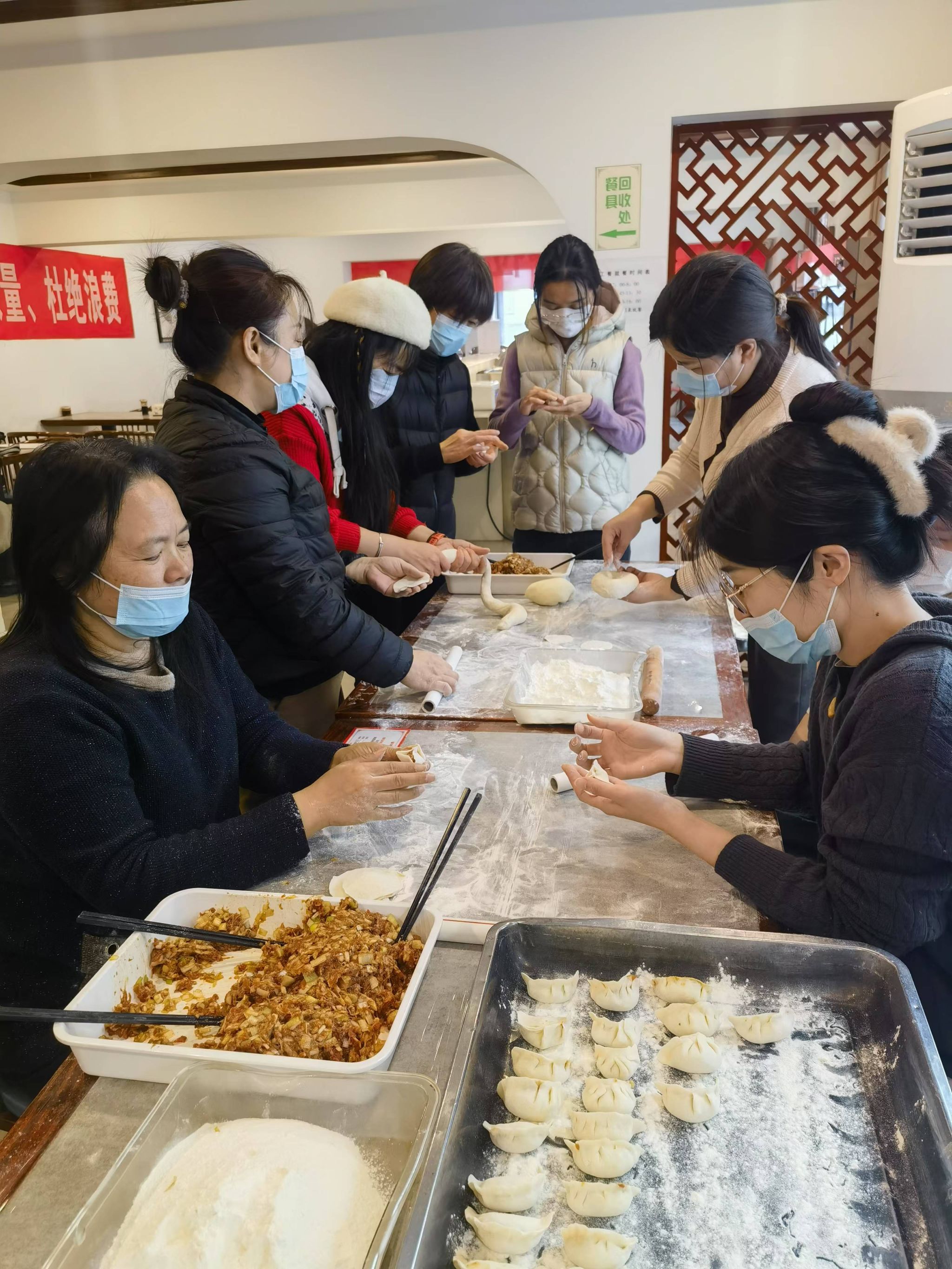 上午十点,大家齐聚食堂,活动现场热闹非凡,大家分工协作,和面、擀皮、包陷,忙的不亦乐乎,还互相交流着各地不同的包饺子手法和冬至习俗,欢声笑语回荡在整个场地。经过两个小时的努力,一排排各具特色的饺子“整装待发”,准备下锅。随后,大家一同品尝着自己亲手包的饺子,感受着浓浓的节日氛围和水环大家庭的温暖。此次活动不仅让教职工们在忙碌的工作中放松了身心,也进一步增进了彼此间的情谊,获得了大家的一致好评。